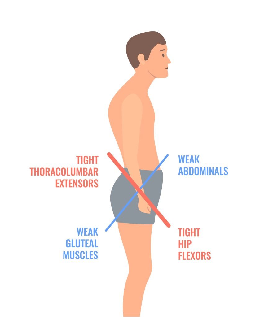 The below image shows what can generally happen to the muscle groups, as well as posture, when LBP symptoms are present.